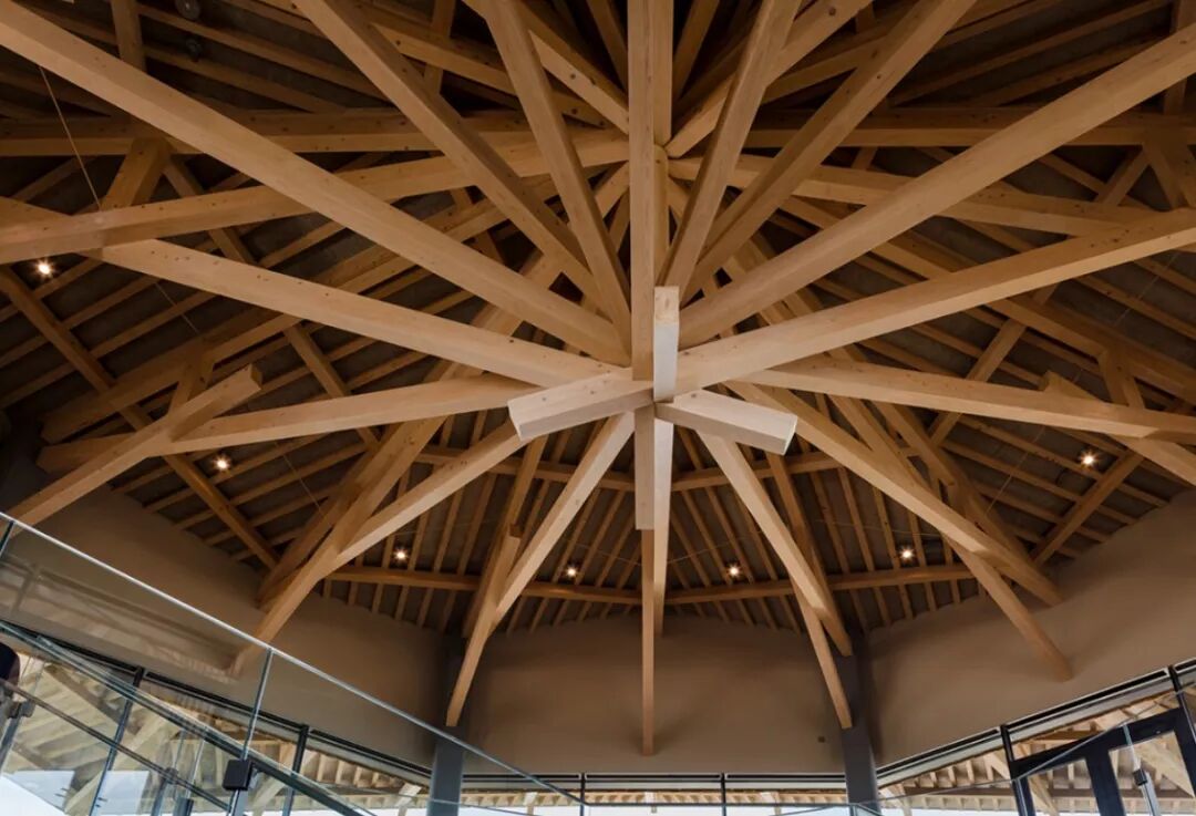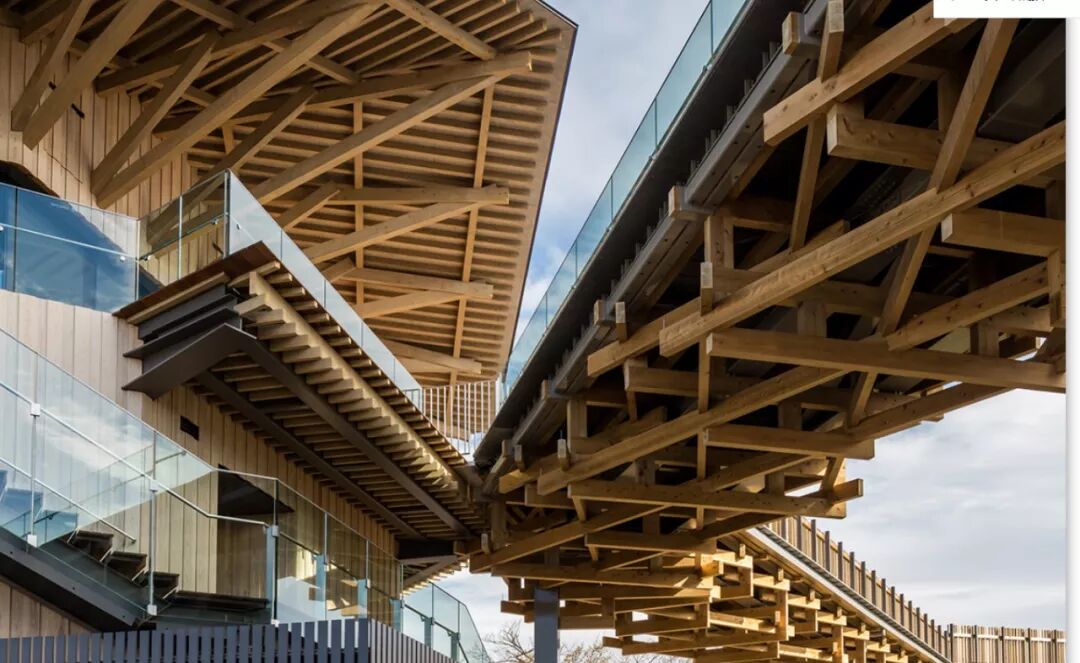 为了解决当地木材过剩的问题隈研吾没有放过任何一个可以使用木材的部位,二层临空部位的玻璃栏板设计是一个亮点,在木材和玻璃之间的交接用玻璃的表面变化实现了一个过渡,功能和美观都得到了兼顾。