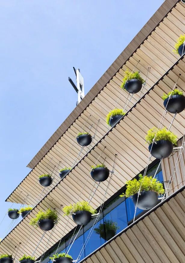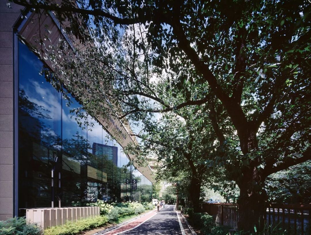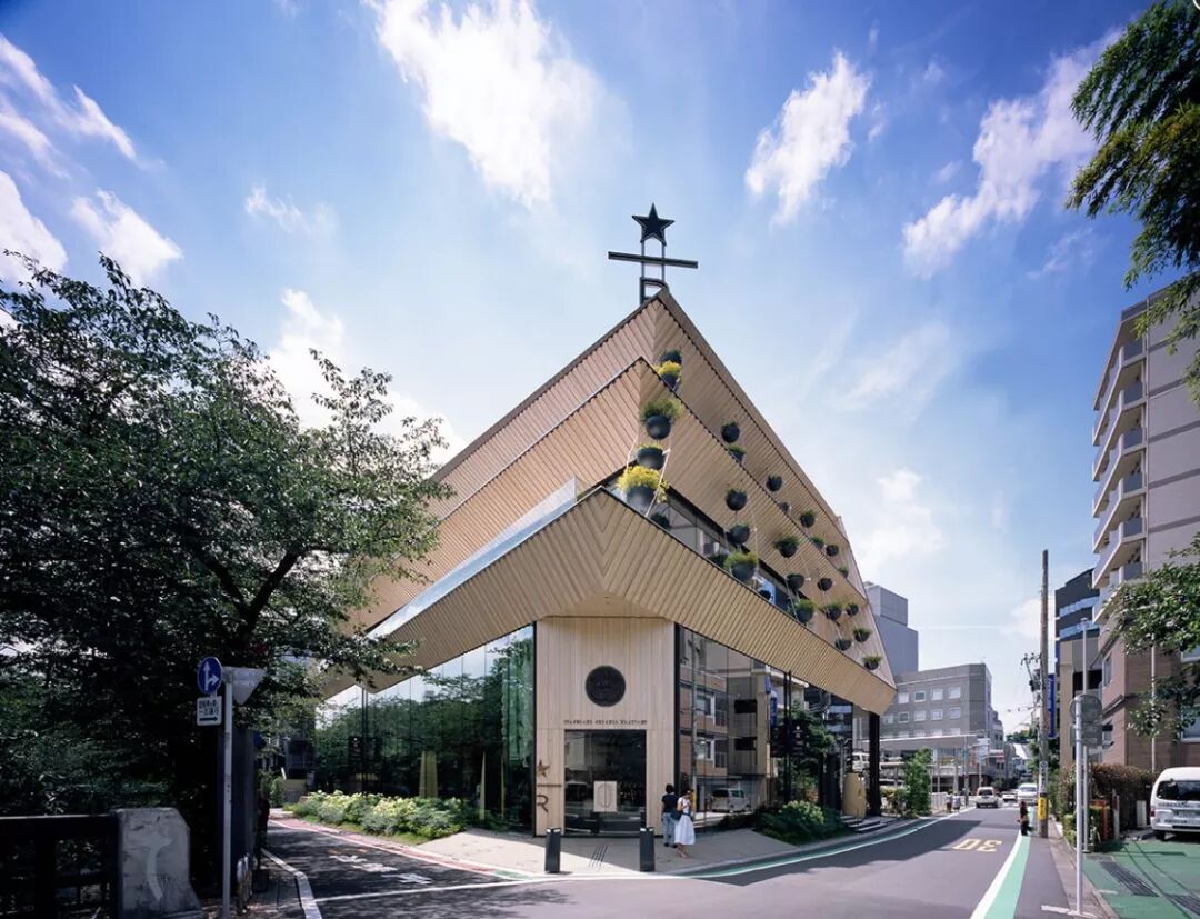 阳台用玻璃做护栏,是观赏樱花的标志地点。每一层倾斜的屋檐都用条木环绕,室内分布了 2100 朵铜制樱花装饰,借此来呼应中目黑作为东京赏樱名地的特色,整体就像是室内开满了一树金色的樱花。