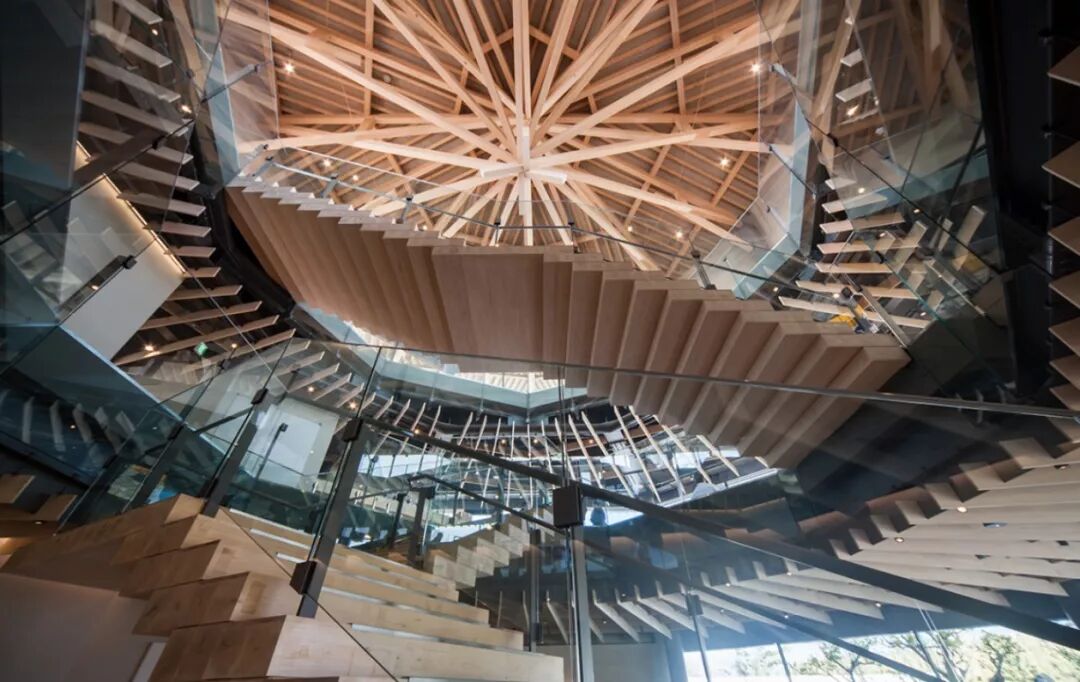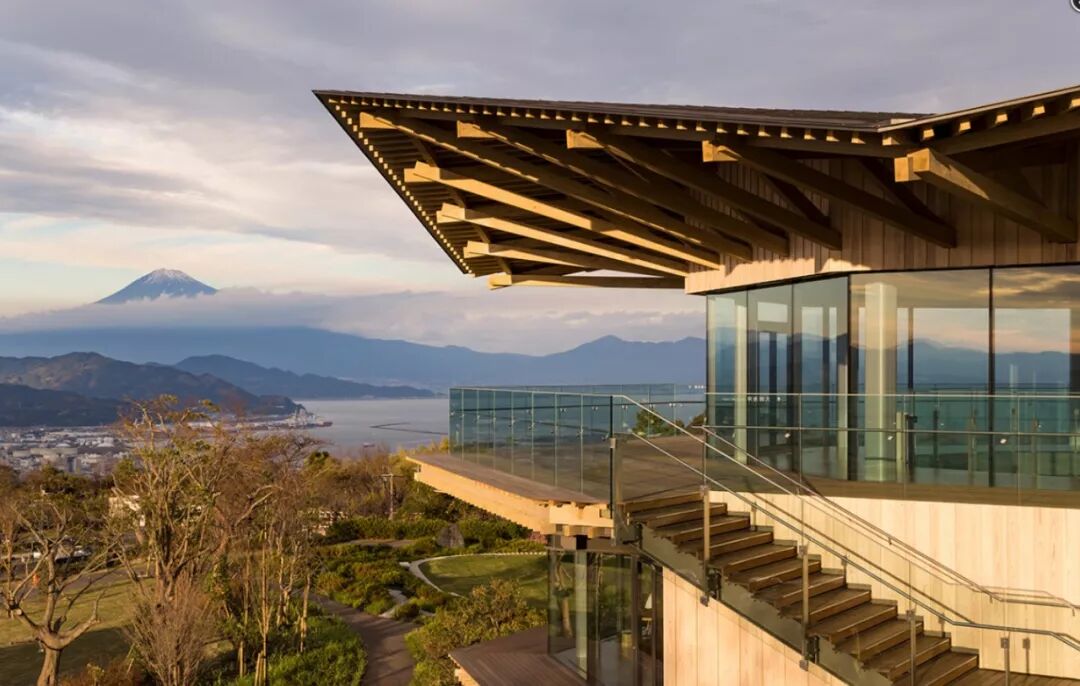 该建筑的特点是落地窗,建筑取材于当地静冈县的柏木,这种独特的几何形状赋予了树枝的复杂性,并创造了与富士山外部和谐的森林般的统一感。