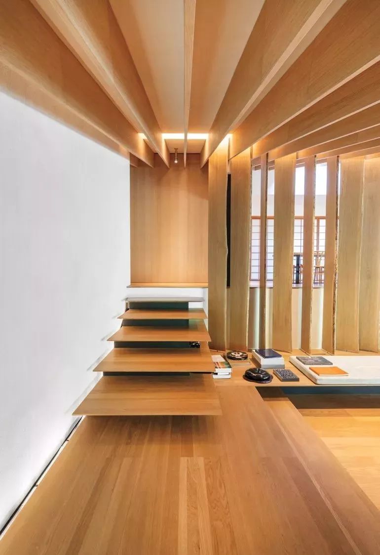 在建筑细部,团队做了非常细致化的雕琢,木质隔断的设计取代厚重外墙,给人自然而轻盈的感觉。通过将天然木材垂直网格和丰富的纹理与白色墙壁相结合,可以构造外立面以确保建筑的隐私,温暖而柔软。