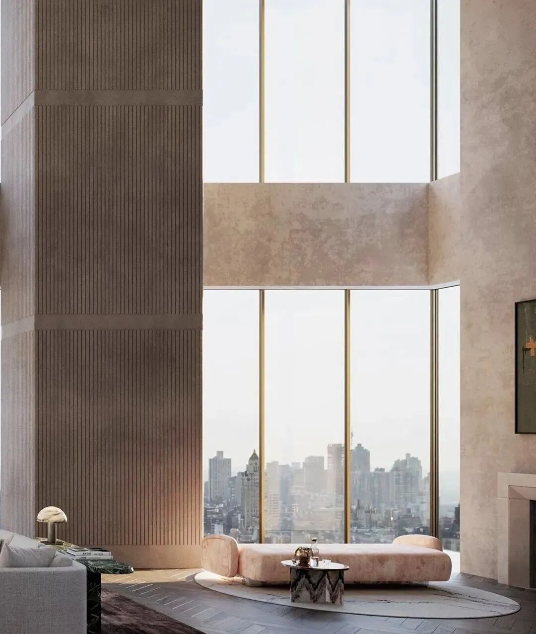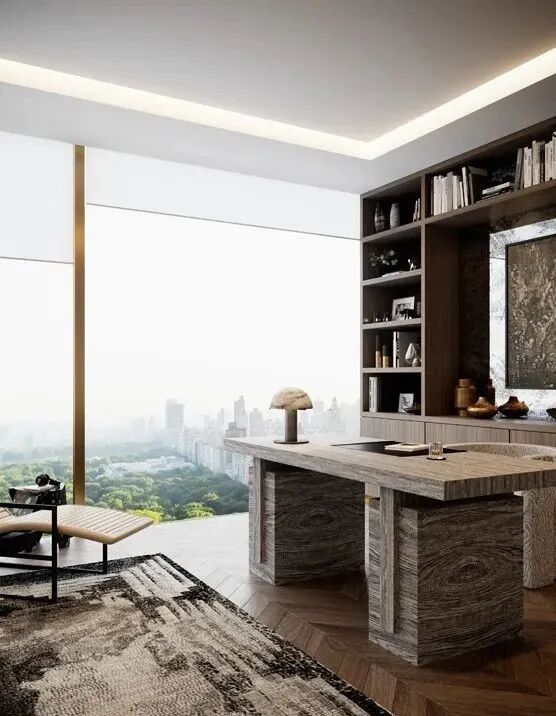 浴室直面中央公园美景,定制的大理石材质高级感十足!不同材料的混合,为空间增添奢华质感。