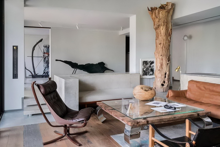 艺术会客厅里的胡杨木来自内蒙古,树心安装了一个光源,开启时,抽象的光影映照在二楼过道的外墙上,充满浪漫和想象。