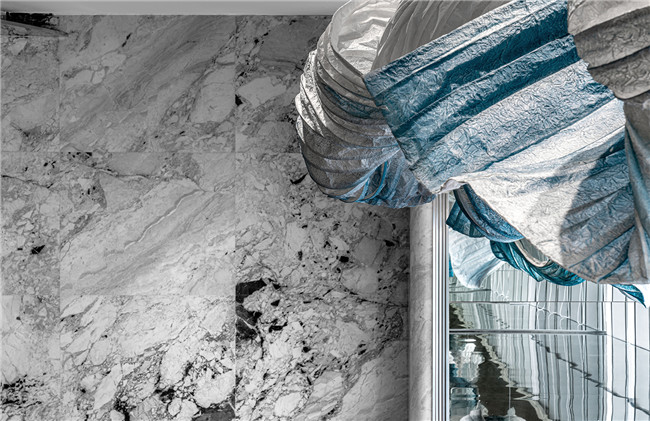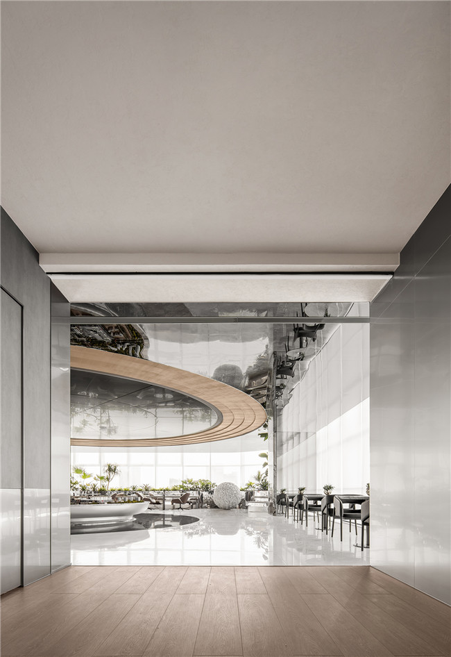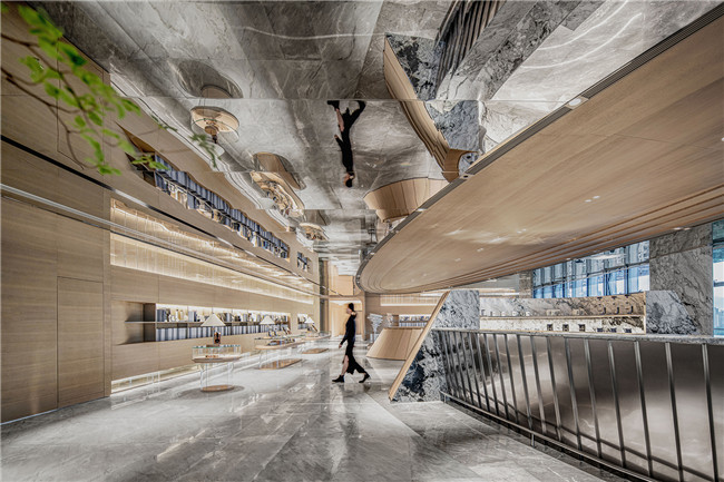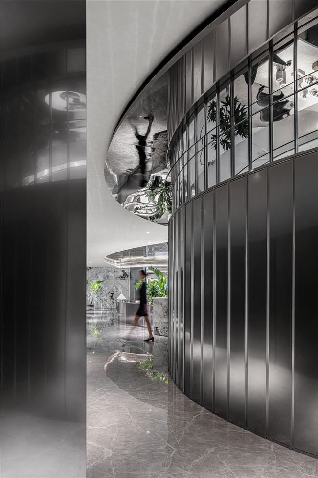 一个空间周围的光影能改变整个环境的性格,镜面的反射也带入了城市的光影变换,日升日落之间,让光线成为了空间秩序的一部分。石材与镜面材料从碰撞到融合,让空间带有几分自反式的科技禅意。