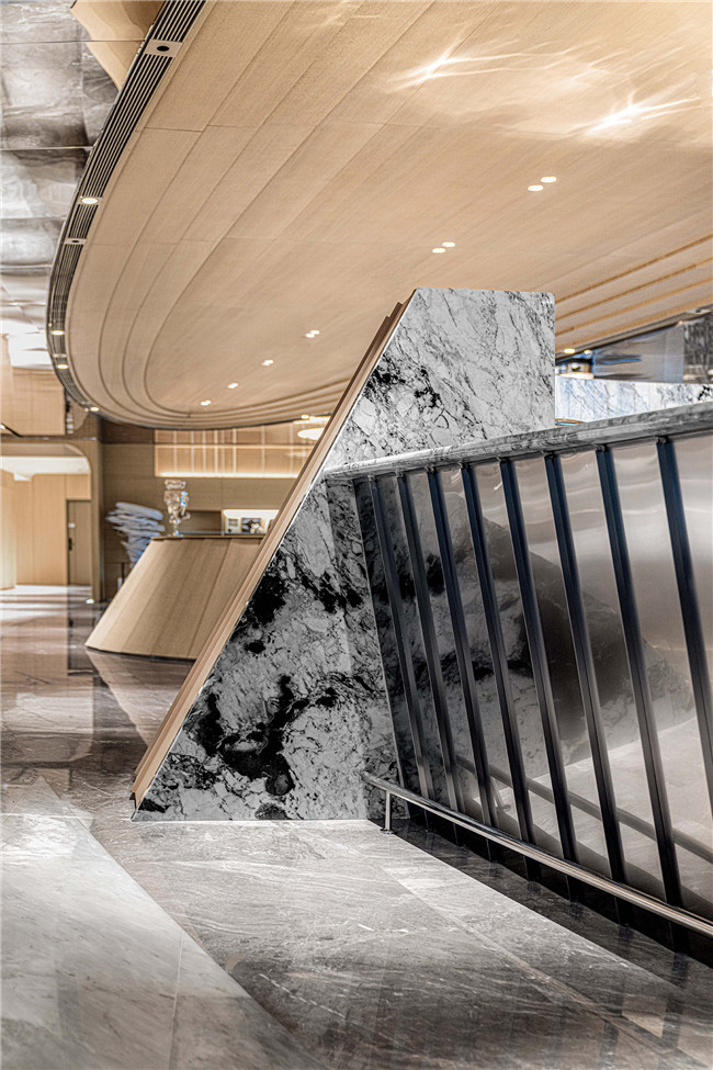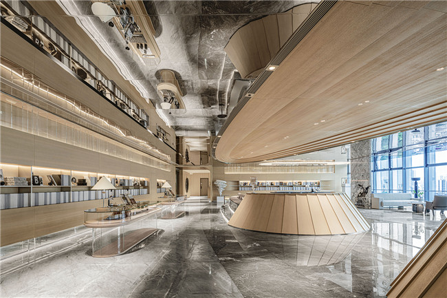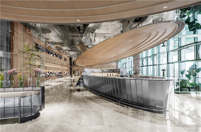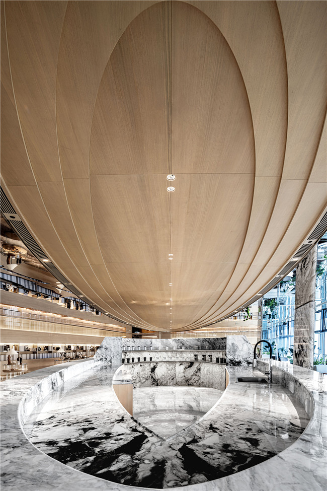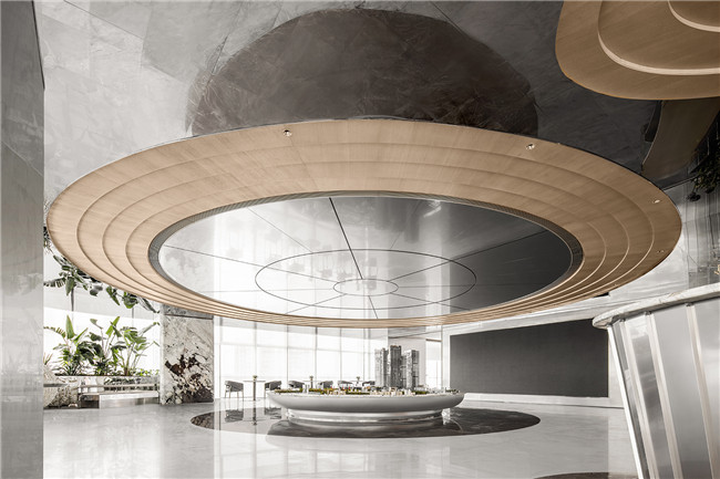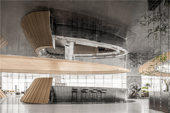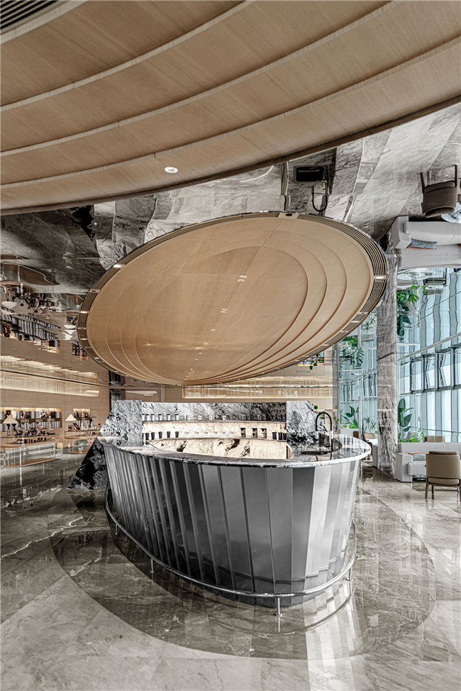 呼应顶部多层次木饰面波纹,将空间中的美学符号进行形式上的统一,在周围顶部镜面不锈钢的倒映下,木饰面、镜面不锈钢与石材的碰撞让空间的肌理质感有了无限的可能。