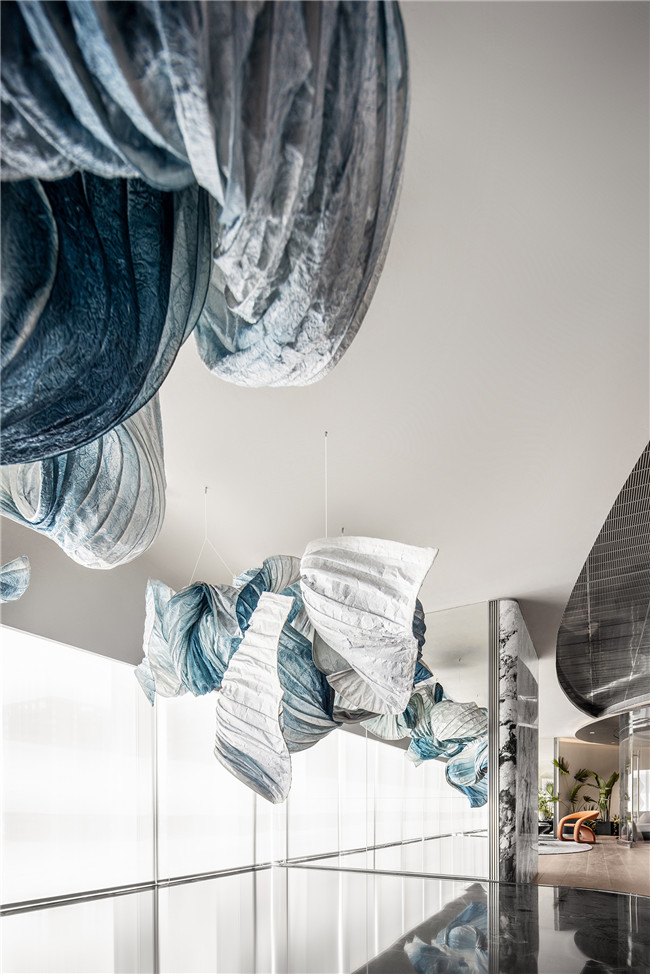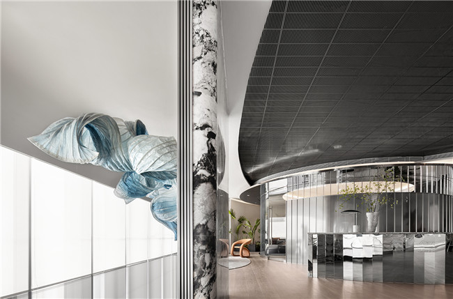 进入金融会客厅中,首入眼帘的就是代表空间精神内核的艺术装置,装置将鲸与城市元素抽离融合,通过空间的叠合,刹那间拟合巨鲸跃出海面的瞬间,在城市与时代的浪潮中汹涌前行。