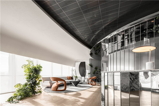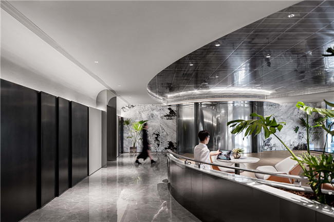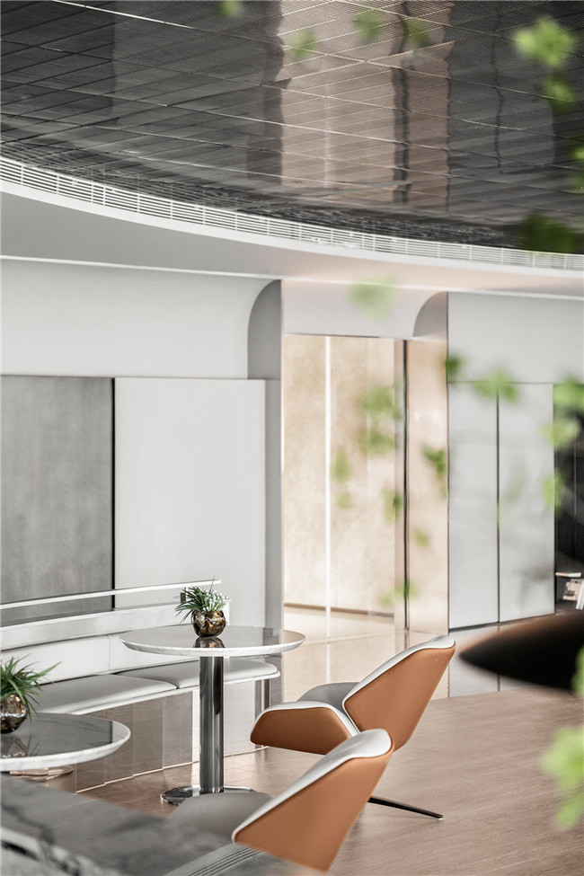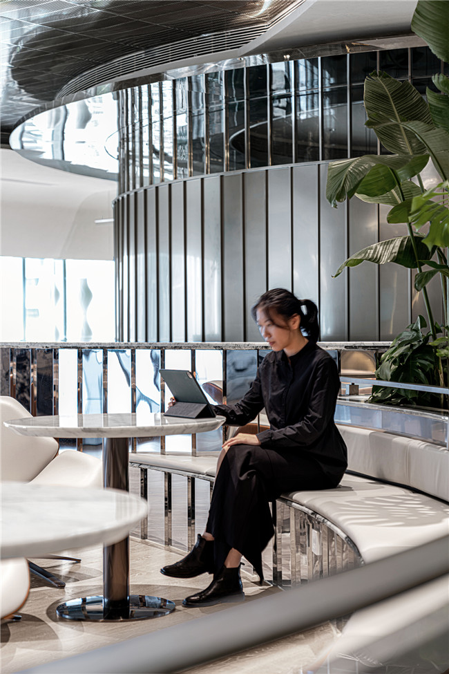 高级灰在光线的映衬下为等候大厅赋予不落凡流的色彩基调,卡座区域蜿蜒流畅的曲线勾勒呼应顶部简约、极富线条感的不锈钢格栅创意设计,让光影流转,空间中的未来科技质感在此刻展现毕尽。