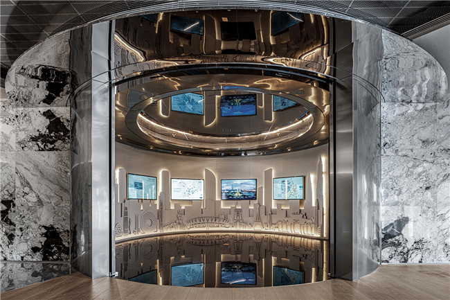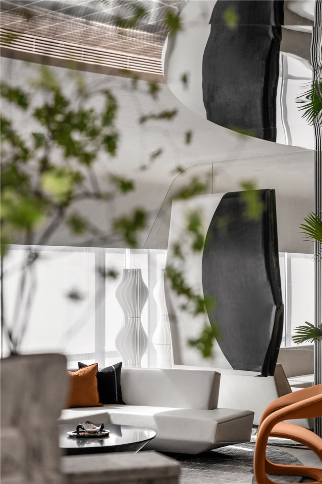 从等候区到沙盘区,再到洽谈区,乃至到样板房通道,半开放式的功能空间设计、镜面创造的无限空间,让空间中的动线如设定好的航线般自然游动。不再孤立、不再隔阂、不再迷惘,这是空间对人精神世界的最大尊重。