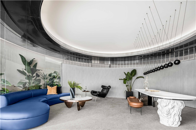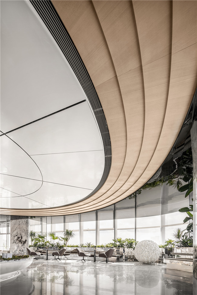 VIP空间是整个等候厅的视觉亮点,圆弧形的玻璃幕墙让整个空间处于“隔而不绝”的状态。