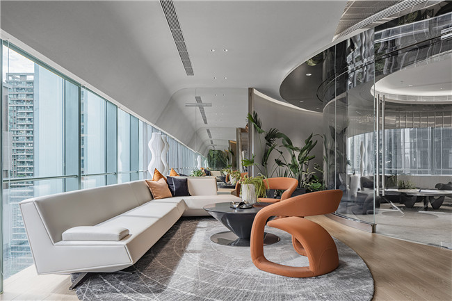 占据了绝佳景观位置的洽谈区,玻璃幕墙与镜面不锈钢的交互掩映,引入大面积的自然光线,室内分散照明点缀空间,让整个金融会客厅的光感呈现最大化,佛山繁华都市外景让静止的空间有了动感的韵律。