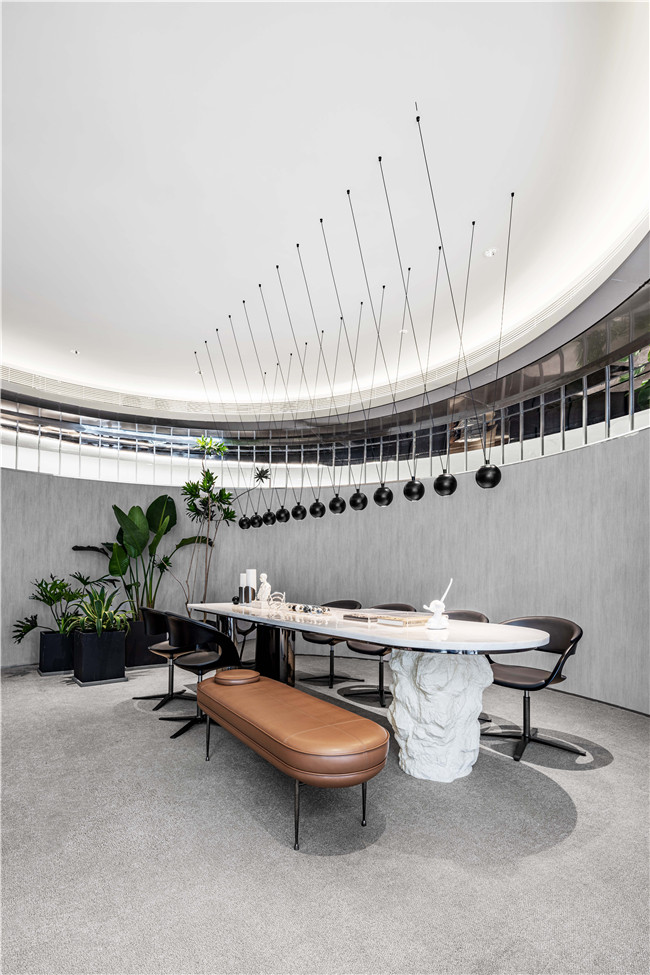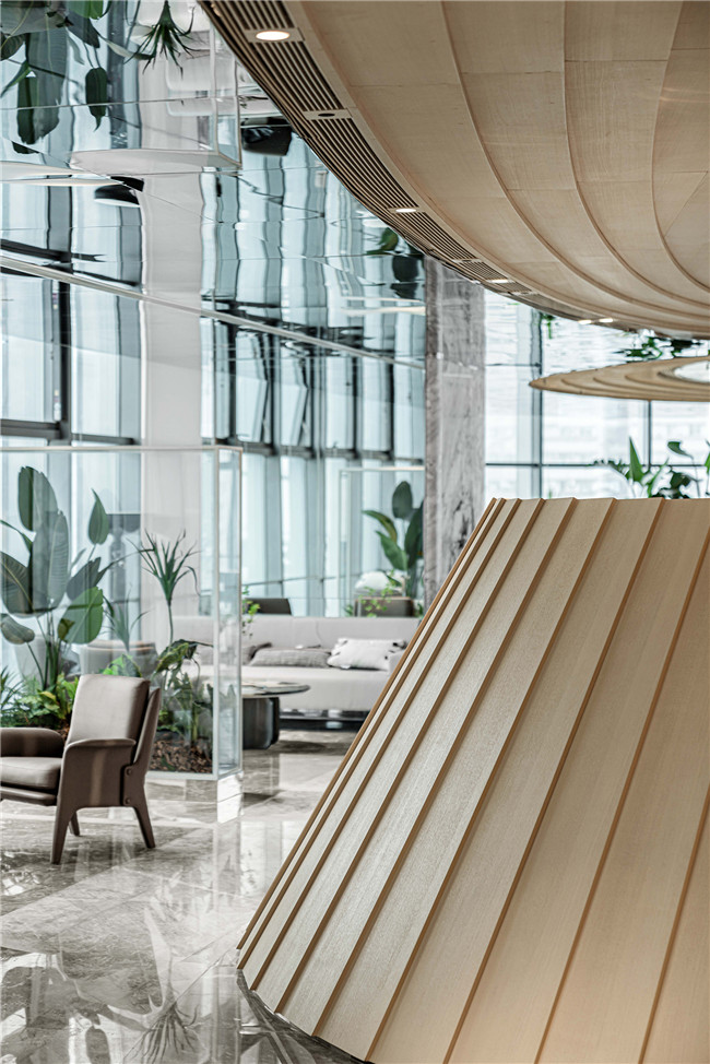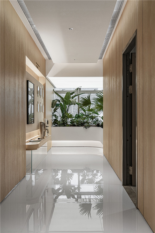 空间中点点绿植点缀,让生机勃勃和商务办公完美结合,让感性和理性彼此交融、绿色与光影相映成趣。