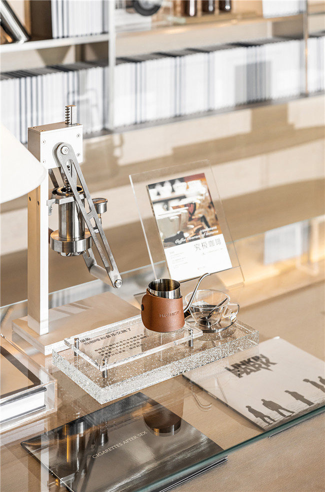 摆满专业周边器具的咖啡体验区与精致香料的闻香体验区,为商务空间带了一抹生活的烟火亮色,生活与商务无缝转换,灵动的空间氛围在此刻流转起来。