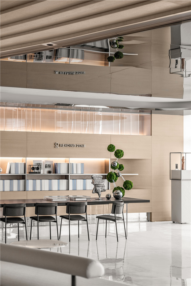 洽谈区视觉中心的水吧台如同城市云海中时隐时现的未来方舟,承载着城市的文化、智慧与艺术,方舟后半“船舱”,以半开放的形式的书吧为承载功能,开放式的长排座位为思想的交汇提供了可能,灵魂的无界在此地永恒。