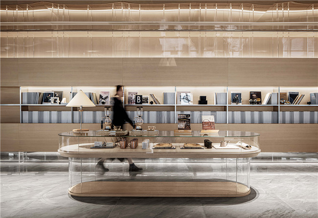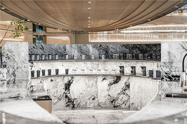 流线型的区域设计与吧台相辅相成,由繁复黑白纹路的大理石构成的“方舟”吧台被“外部船体”用不锈钢材料层叠围合而成,咖啡展示区石材的使用以相同的设计语言对不锈钢船体进行呼应,二者相得益彰,构成了一气呵成的视觉体验。