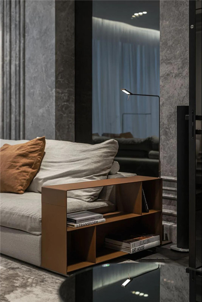休息区墙壁和楼层相互融合,支持空间的整体概念。例如,在主卧室和浴室中设计了一堵普通的石墙,暗示了这两个空间的统一概念。深褐色的单板变成了青铜--勃艮第黄铜,石墙,再加上一个金属的,暗色调的卧室,在主卧室里延伸开来--如果你穿过这些公寓,两者之间的联系是显而易见的。每个新元素都是前一个元素的视觉延续,它在前提之间创建了一个微妙但可感知的纽带。