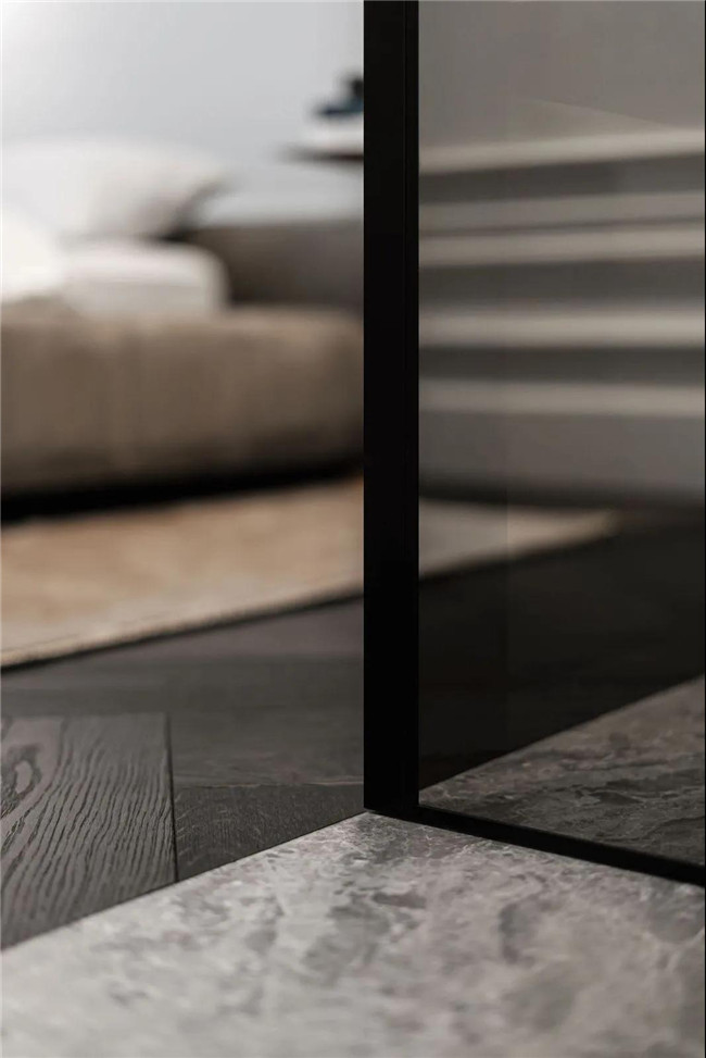 这间公寓的私人区域,主卧室和客卧室,都采用了一种有点禁欲的风格,以加强睡眠质量,为了增加深沉的深暗调,设计师为带有动态滑动隔板的衣柜选择了精美的石墨玻璃。