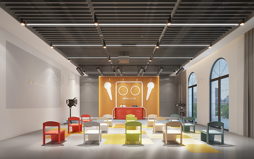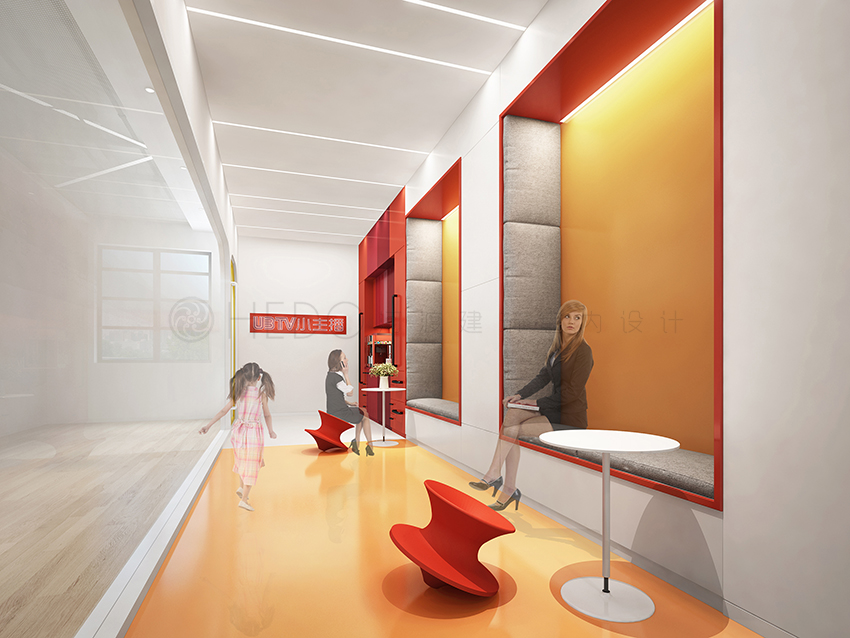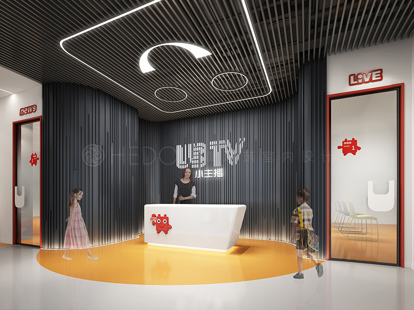 空间设计上运用UBTV品牌标志色红色,再以灰色和橘色作为中和,使空间突破了常规儿童机构的五颜六色的低龄化设计,但又不失其趣味性。前厅背景大胆的使用了黑色,再以发光字体作为互补提升空间酷的味道。背景的线条和天花连贯统一,增加视觉张力。天花的的灯光造型根据LOGO形态进行衍生变化而来,使空间更有童趣。红色在整个空间起到画龙点睛的作用,红色的比例提升了空间的特点并没有使视觉烦躁