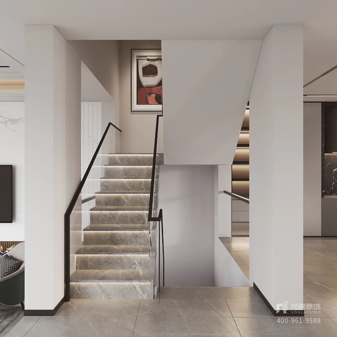 楼梯间的抽象艺术挂画,在斑驳纹理的大理石踏步衬托下仿佛穿越了千年岁月,亲眼目睹了岁月变迁。回忆与现在,生活的日常在空间里演绎,那依稀的欢声笑语,在见证着一家人平凡的幸福生活。