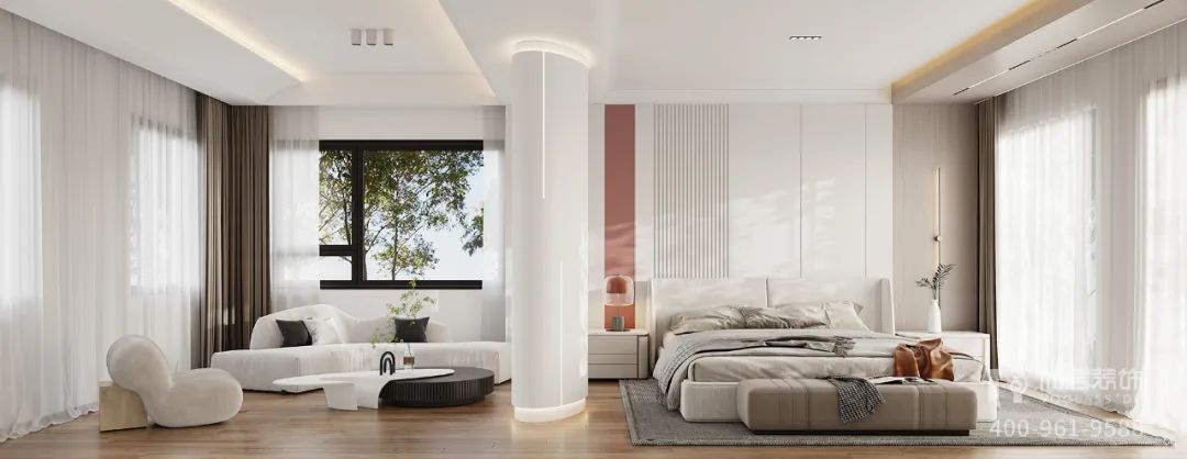 卧室以浅色系为基,在日光的雕饰下,营造出了空间活泼轻松的氛围。线条和体块有序排列,辅以高级灰的床品,在丰富空间层次的同时也让整个空间更加舒适宜居。同时,在设计师的奇思妙想下,空间以圆柱造型来进行空间分割,打造出主卧不同的功能区,以便让业主可以在安宁静谧的时光中寻得自在与舒适。