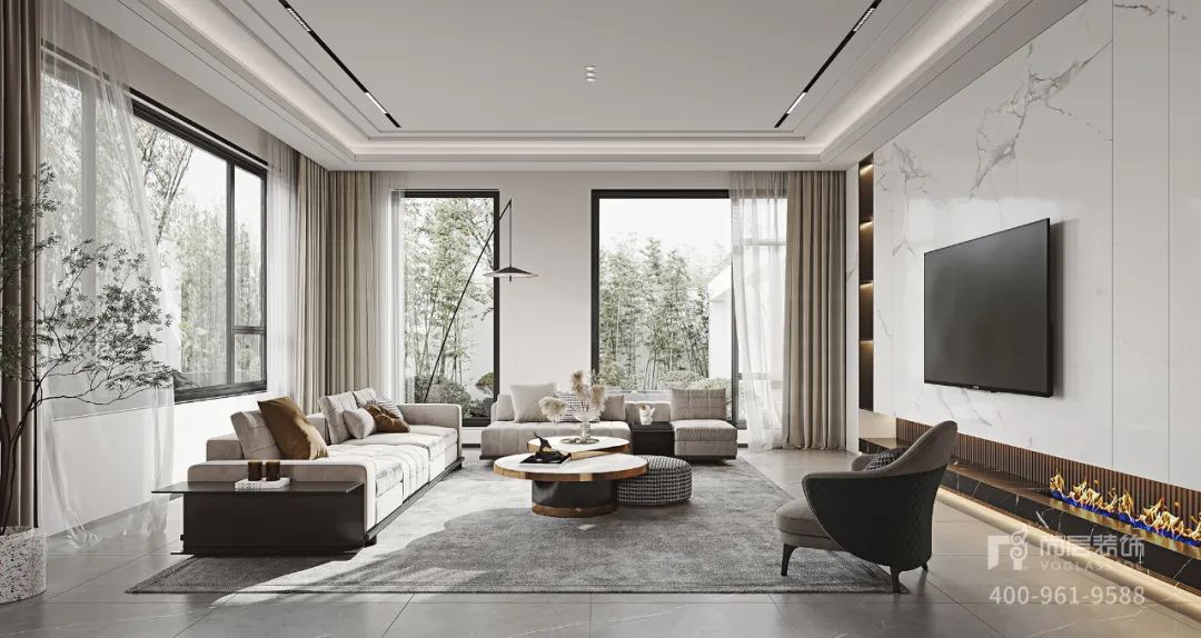 悠然一点绿,最美人间色,客厅大面积的落地窗设计,让整个空间变得更加通透自然,带来身心的愉悦与释放。同时,无主灯的设计理念又让整个空间变得更加具有层次感,再加上低饱和度色调的相互搭配,使整个空间沉稳内敛,返璞归真。