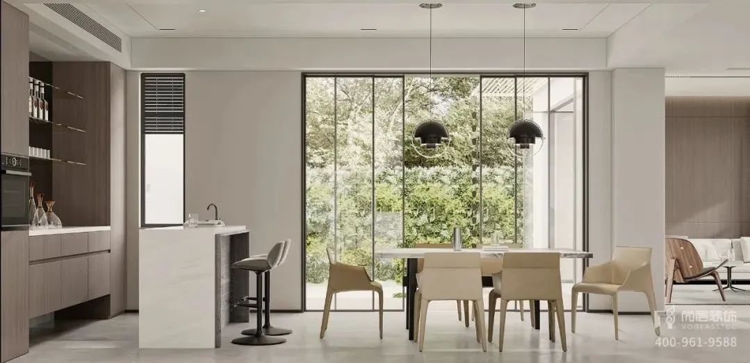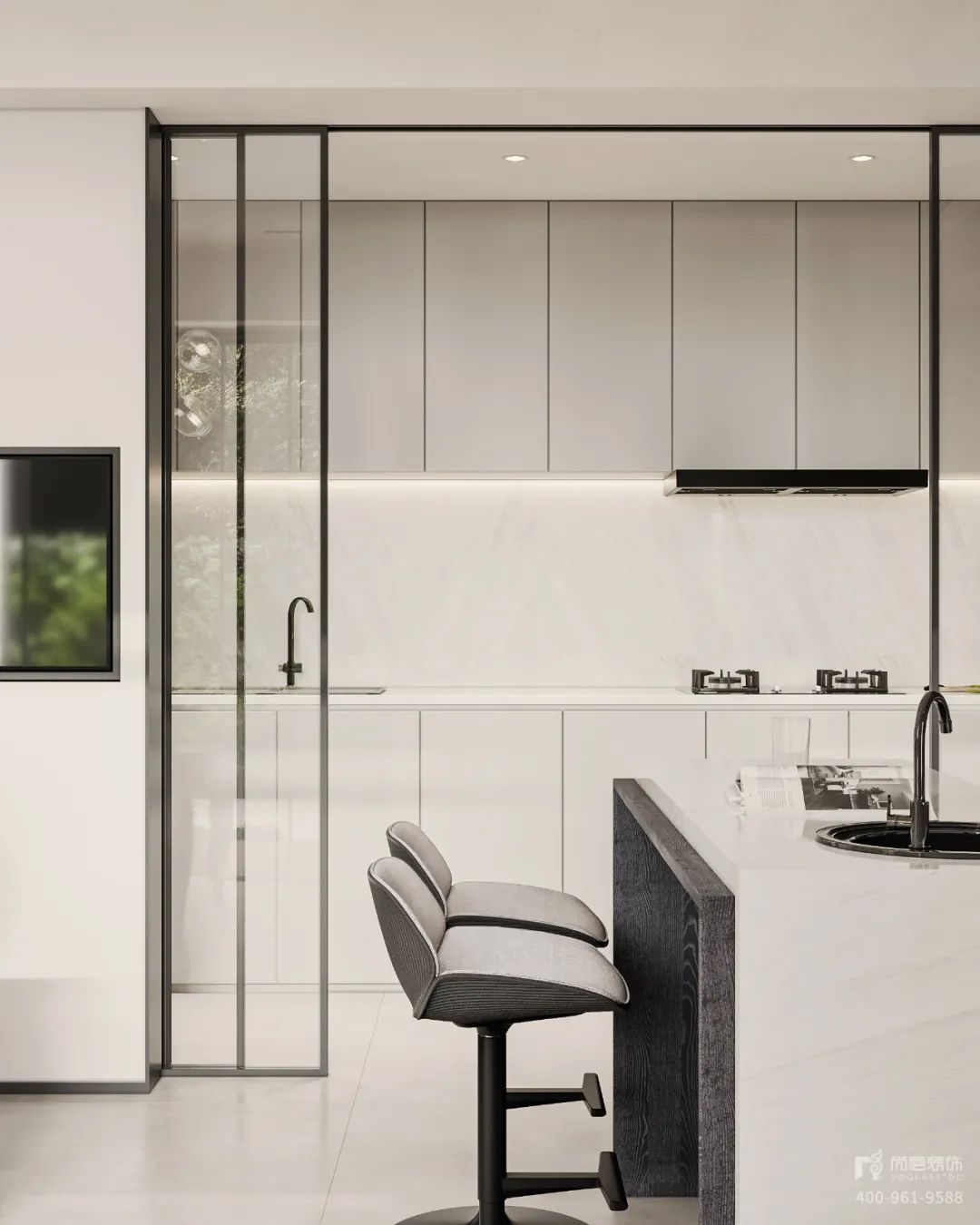 餐厨区,一扇移门引入一室的澄澈与明亮,秉持简练的设计手法,艺术吊灯勾勒空间意趣,金属线条轻描空间质感,在融洽业主生活喜好后,以匠心设计缔造出了一处富有艺术气质与自然舒适的现代餐食空间。一家人围坐展欢颜,对饮笑红尘,于此间品味佳肴美酒,纵享人间烟火浪漫。