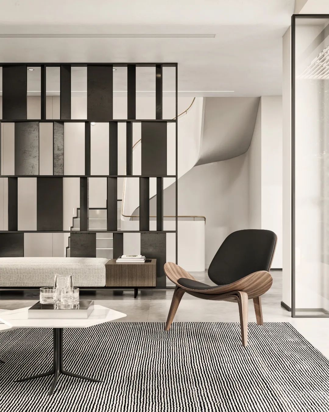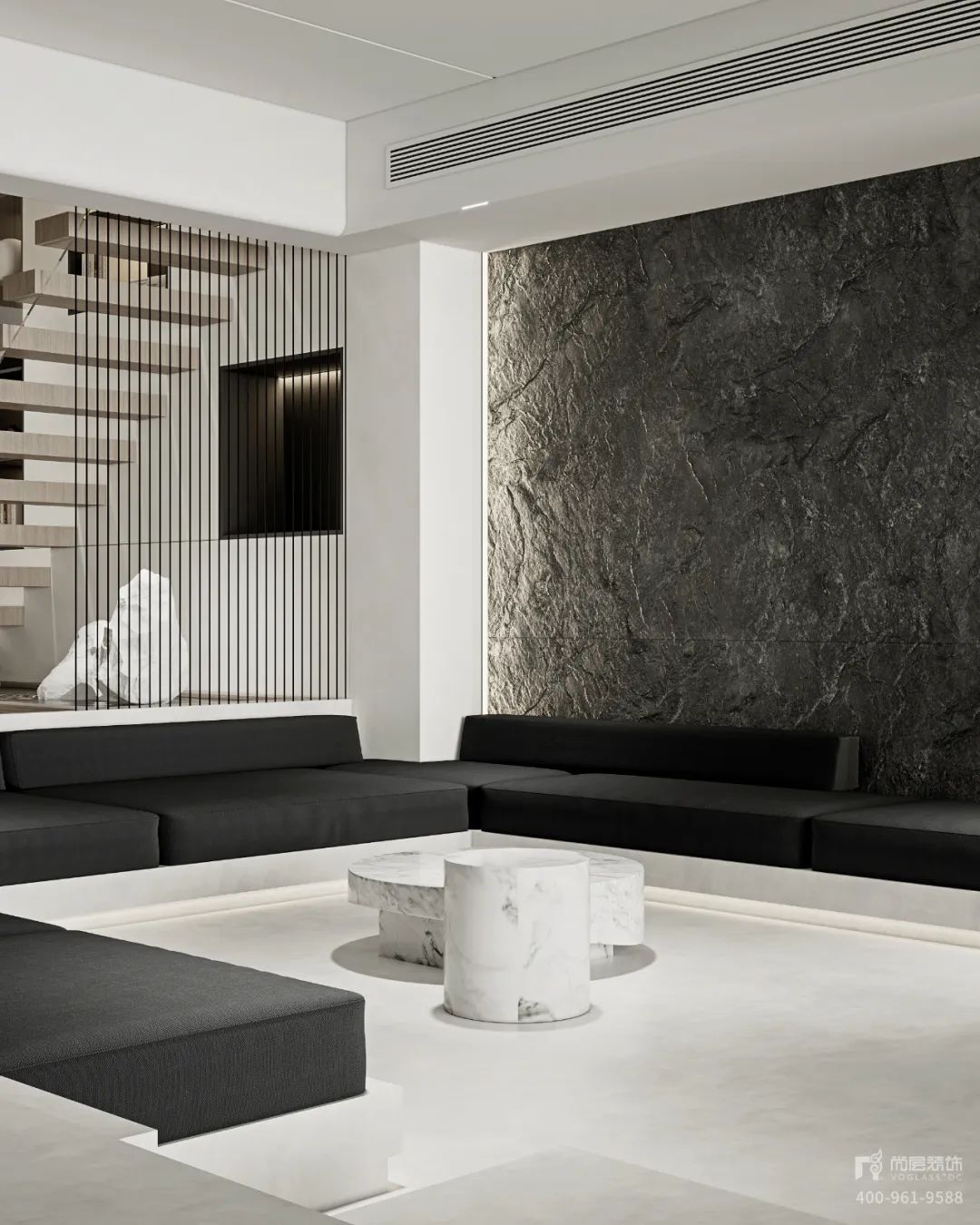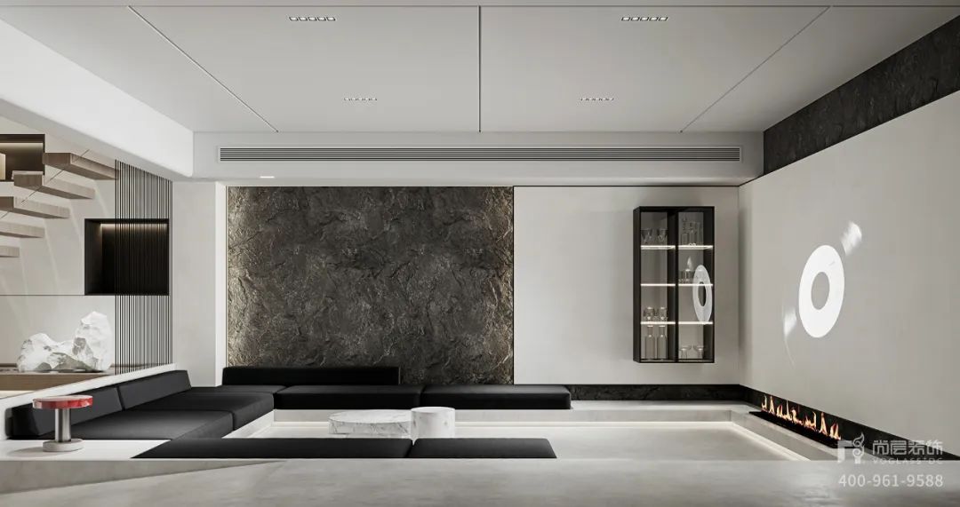 设计赋予空间气质,在黑与白主导的空间里打破清冷的基调,设计师以独特的角度,在简练与冷静的世界里,又加入了一面斑驳纹理的大理石墙面与明黄柔暖的火焰做搭配,驱散了原本的空间清冷,让生活回归宁静的温润。